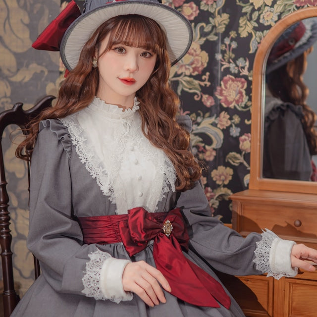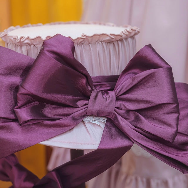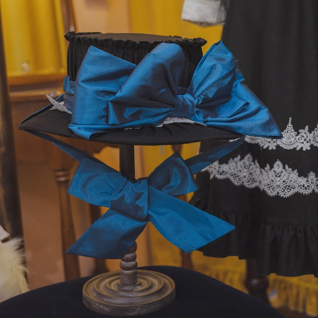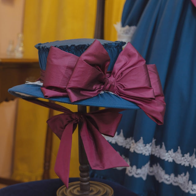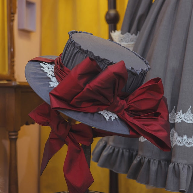 This hat-style bonnet features delicate lace and a large, lustrous ribbon for a refined and glamorous look. Its beautiful silhouette is designed to elevate any outfit. It's a statement piece that will draw attention and be the highlight of any occasion, perfect for tea parties or special occasions. Available in four colors: black, gray, blue, and pink!