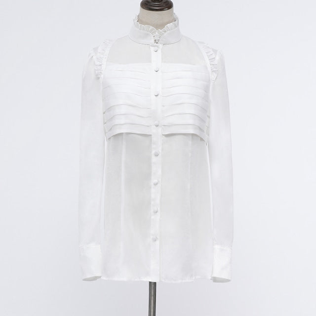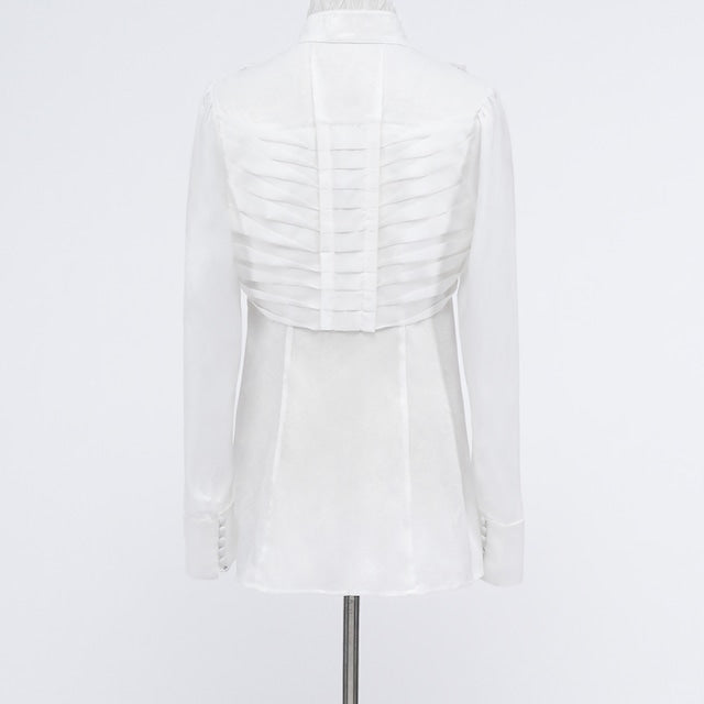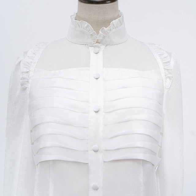 The ribs and spinal bones on the front and back are created by repeatedly sewing and folding the fabric. Ribbons and ruffles around the collar and buttons give it a gothic feel.