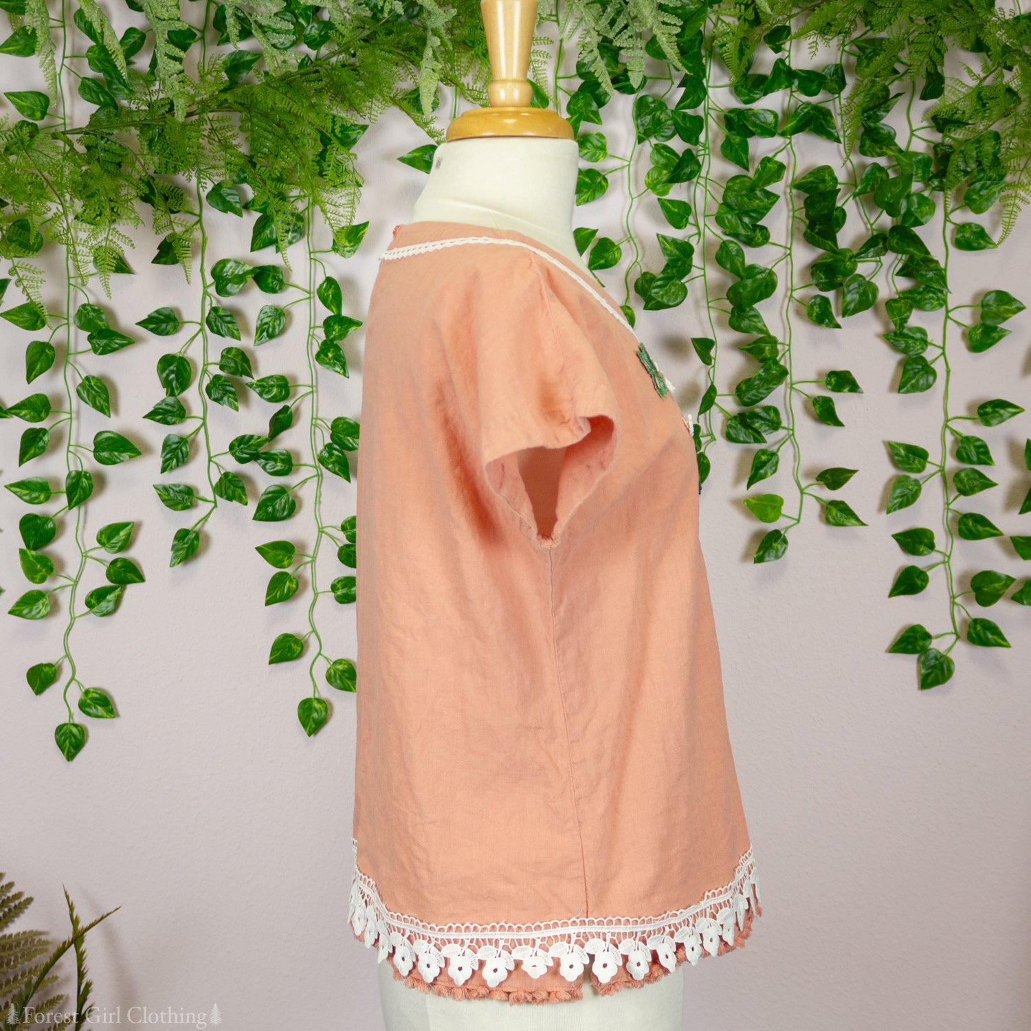 Materials: 55% linen, 45% cotton fabric; polyester and cotton lace trims.