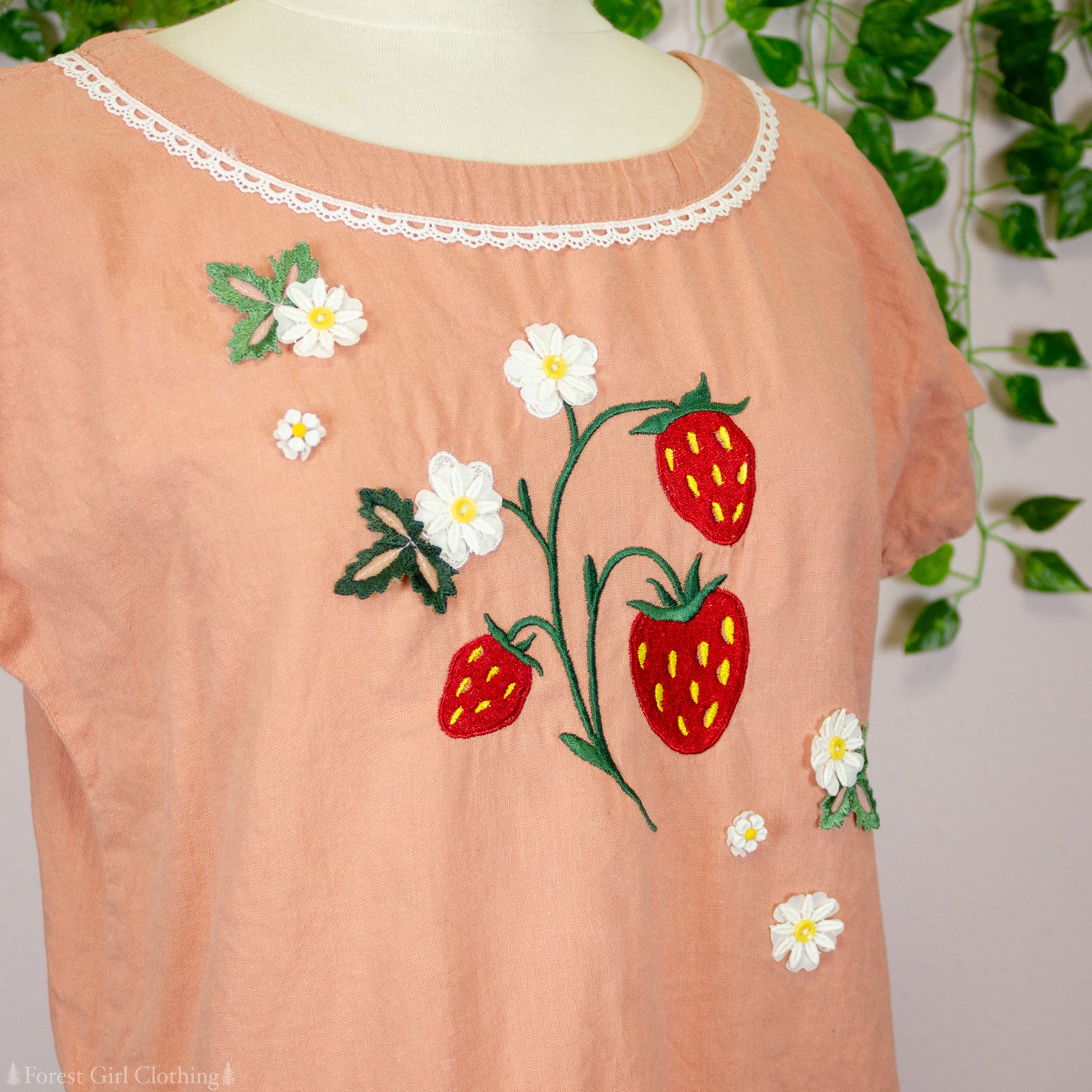 This sweet strawberry top features custom embroidery, 3D flower and leaf appliques, and cute button details. All of the decorations are designed, cut, and/or hand-dyed by Atelier Heidi. The fabric is a beautiful linen/cotton  blend with a soft hand and a warm pink color.