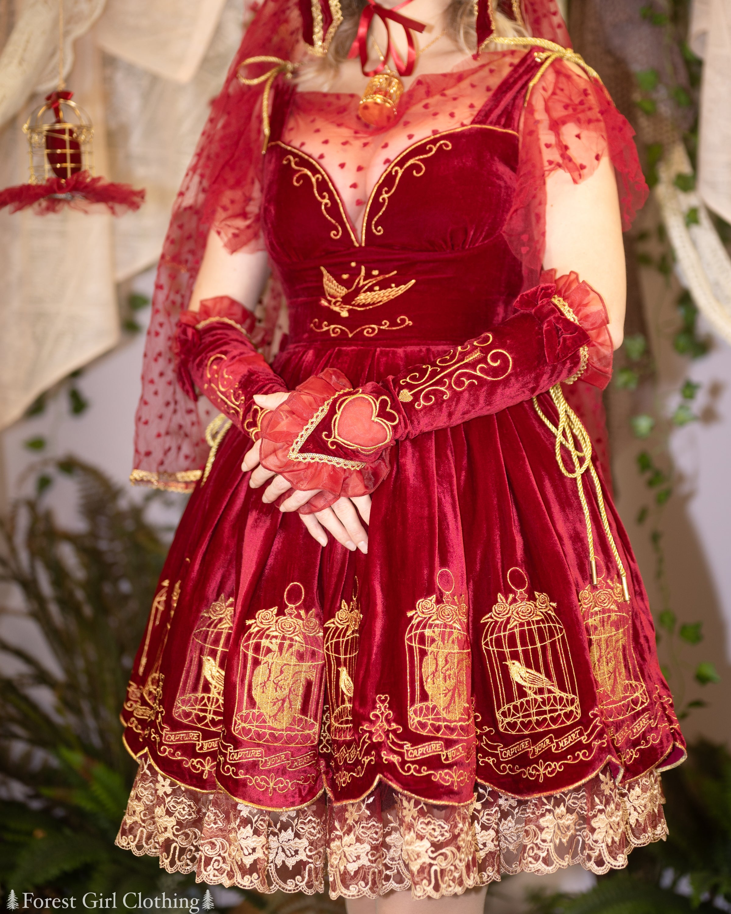 "Capture Your Heart" -- a dress to enchant and captivate. Made with bold red velvet and ornate gold embroidery depicting swallows, birdcages, and anatomical hearts. This is our custom original artwork inspired by love in all its complexities.