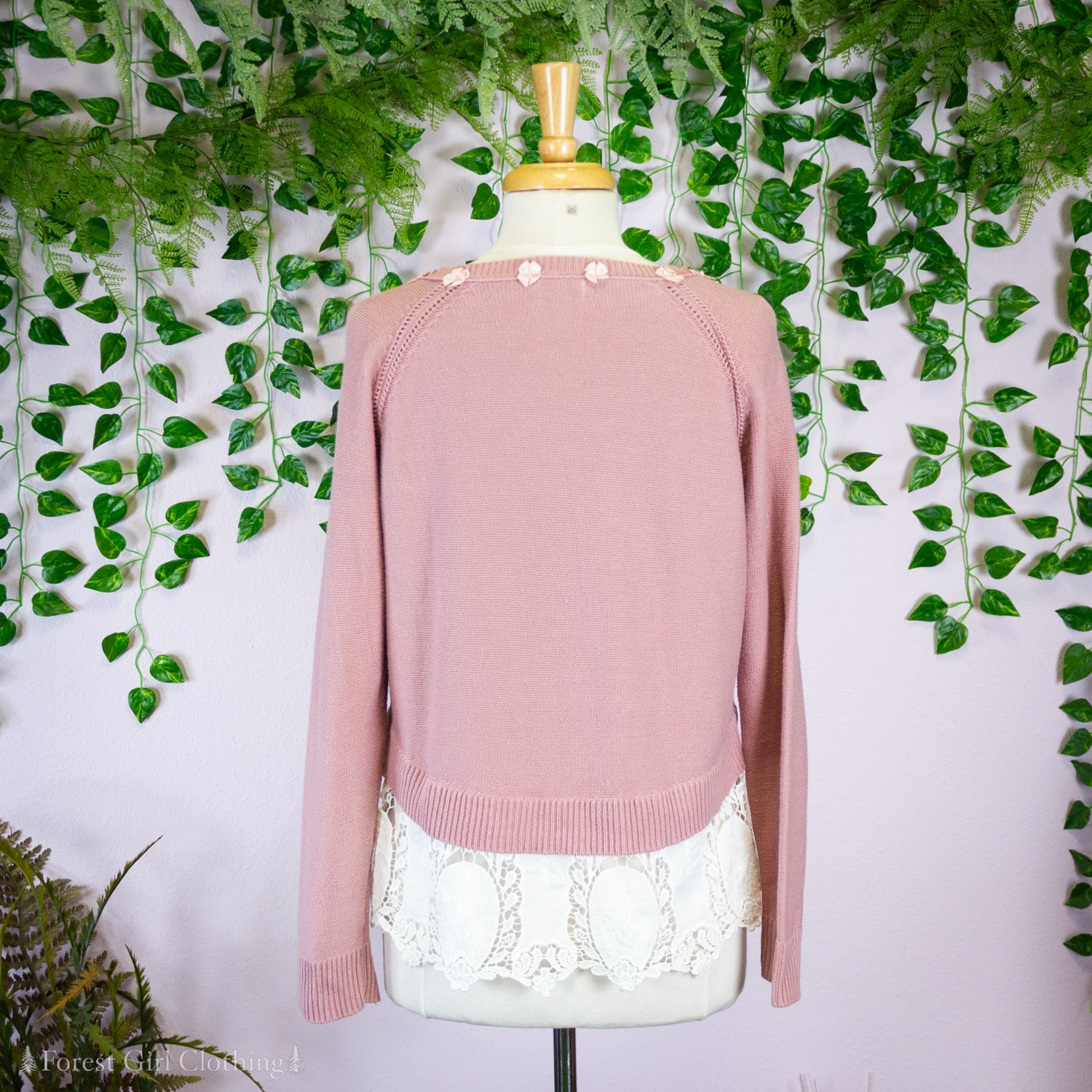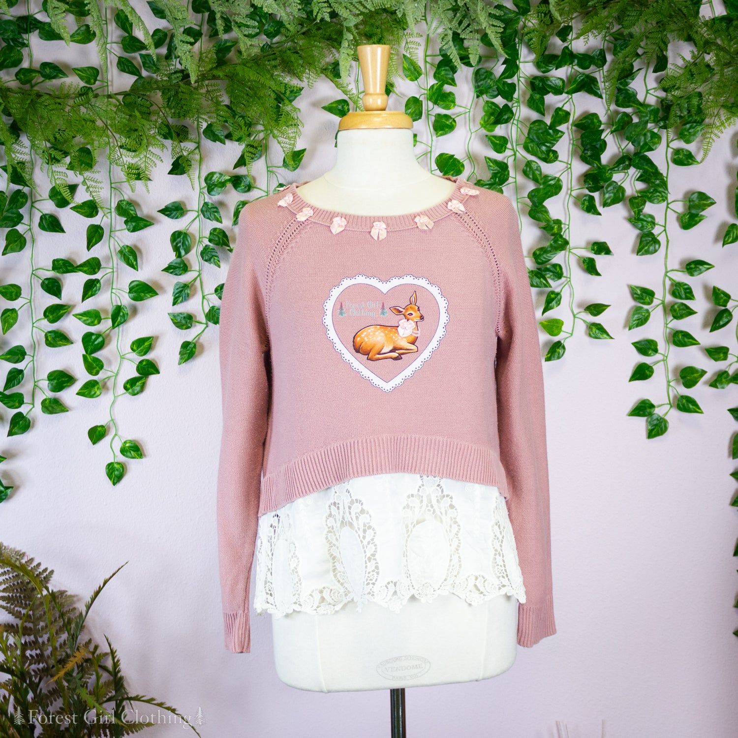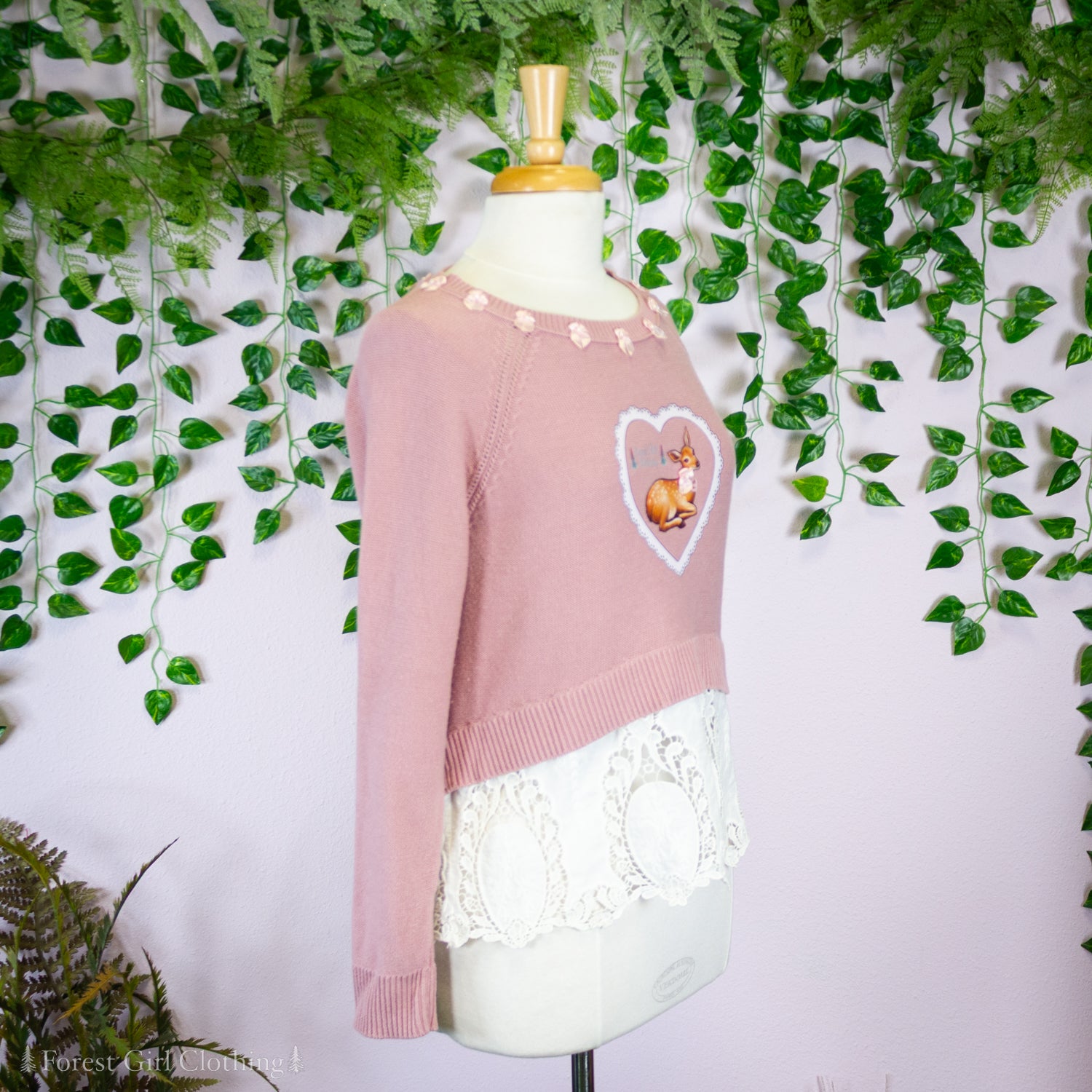 Made from pink cotton, this sweater is decorated with custom artwork by Atelier Heidi. Wide cotton lace provides a feminine ruffle at the hem.