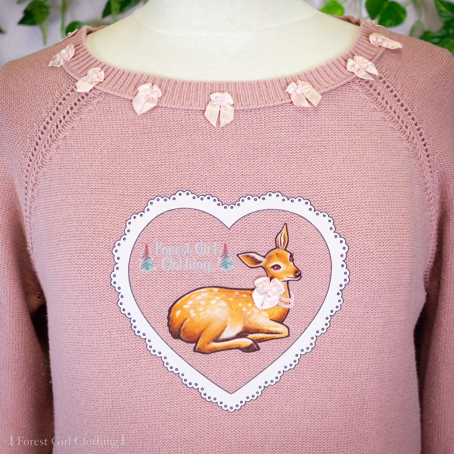 A sweet little deer, decorated with bows and pearls.